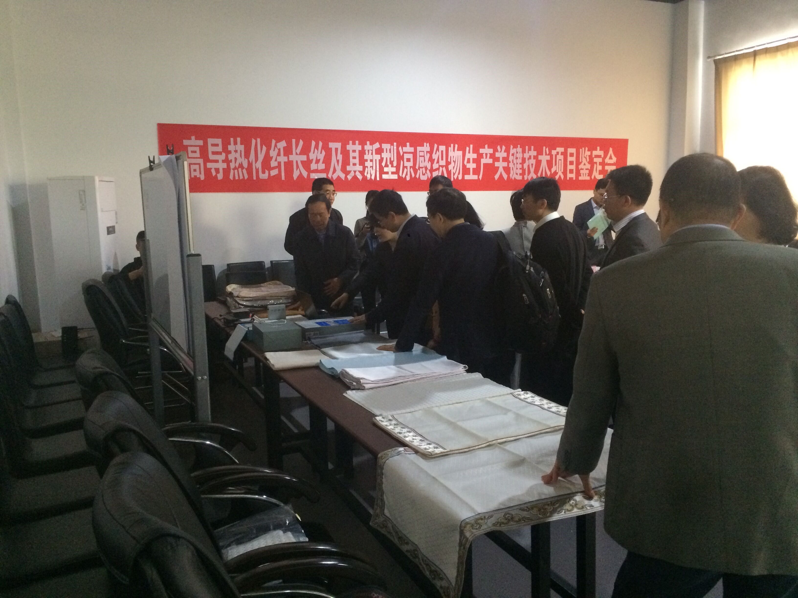 2017年427日,中國紡織工業聯合會組織召開了高導熱化纖長絲及其新型涼感織物生產關鍵技術項目鑒定會(見圖1、圖2)。其中,由我公司和總后軍需研究所合作研制的用于測試涼感織物涼爽性能的快速響應式FFZ415熱流式織物涼感測試儀,受到了鑒定委員會的認可,項目順利通過鑒定。